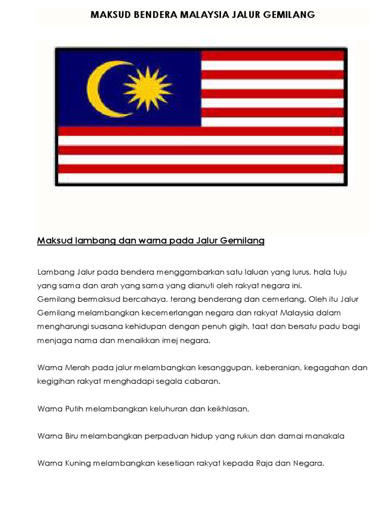 Di balik corak dan warna jalur gemilang tersirat makna perihal negara berdaulat. Ciri-Ciri Penting Yang Terdapat Pada Bendera Malaysia. Kenali bendera bagi setiap negeri dan wilayah persekutuan di Malaysia.